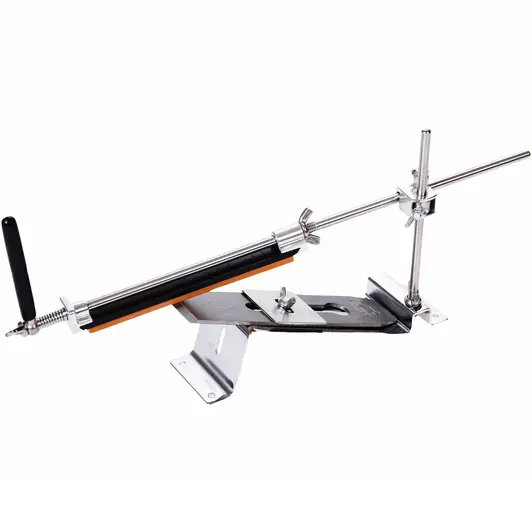 Модель Ruixin PRO III — полностью выполнена из никелированного железа. Основание точилки можно прикрутить к столешнице болтами или же просто поставить на стол и придерживать во время работы рукой. Точильный станок собирается из нескольких деталей, поэтому в разобранном виде он очень компактный и удобный для транспортировки. В комплект входит сразу четыре точильных камня, каждый из которых закреплен на пластиковой подложке. Из можно достаточно быстро закрепить на направляющей и поочередно менять для достижения наилучшего результата. Зернистость этих камней составляет 120, 320, 600 и 1500 грит.