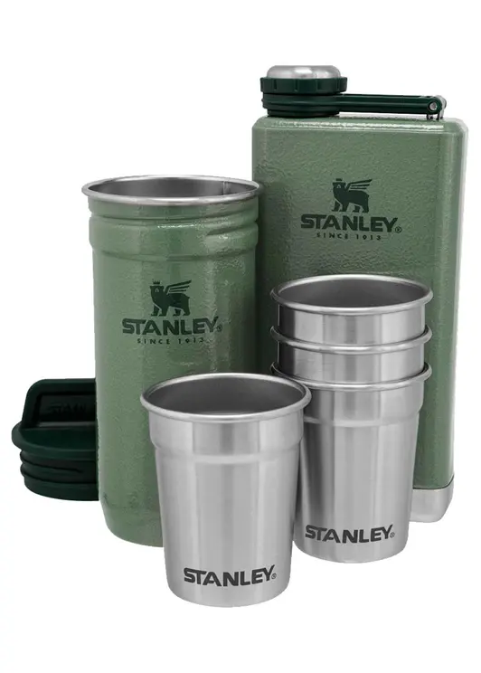 Набор контейнеров STANLEY Adventure включает четыре стопки объёмом 59 мл и флягу объёмом 0,23 л. Все предметы изготовлены из высококачественной нержавеющей стали марки AISI 304, устойчивой к коррозии и механическим воздействиям. Стопки и фляга оснащены крышками, которые плотно прилегают к корпусу и обеспечивают герметичность. Это гарантирует сохранность содержимого и удобство использования.